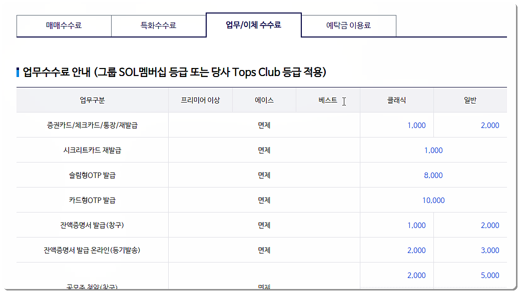 업무 수수료는 등급에 따라서 달라지는데요. 슬림형 OTP 발급 수수료는 8,000원이고 카드형 OTP 발급 수수료는 10,000원입니다. 시크리트카드 재발급 수수료는 1,000원인데요. 베스트, 에이스, 프리미어 이상 등급은 수수료가 면제됩니다.